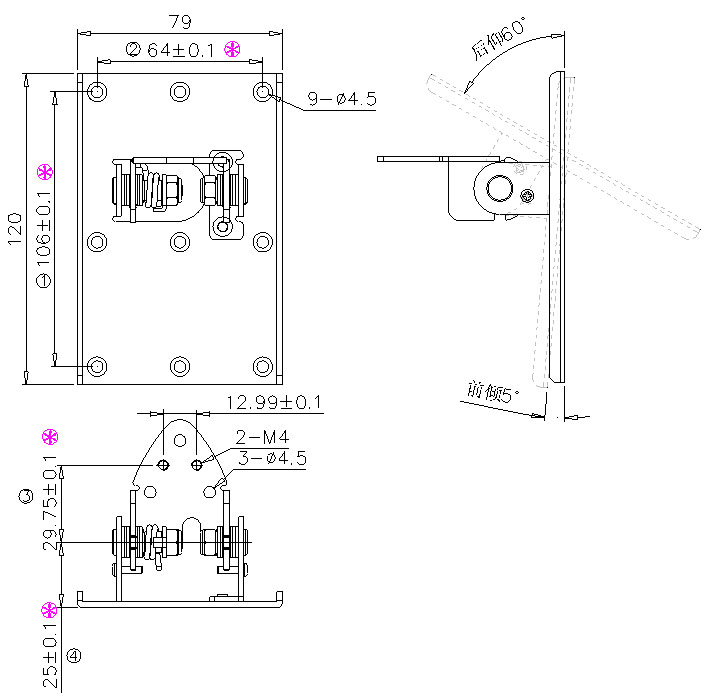 4.轉(zhuǎn)軸旋轉(zhuǎn)角度:前傾5°后仰60°。
